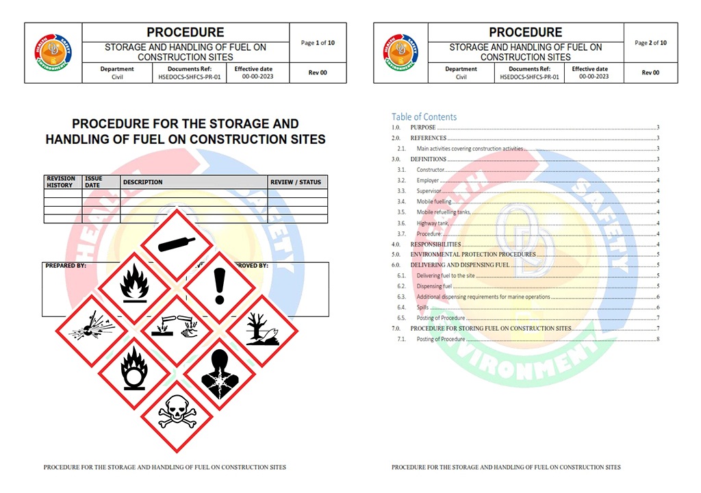 This procedure for “PROCEDURE FOR STORING FUEL ON CONSTRUCTION SITES”, uploaded by the QHSE Documents outlines the safe storage, handling, and emergency preparedness for fuel storage on construction sites in compliance with international standards and codes, including NFPA (National Fire Protection Association), OSHA (Occupational Safety and Health Administration), ISO 45001, and local regulations.